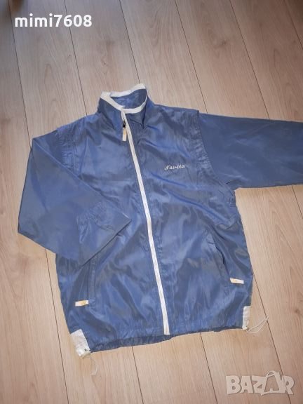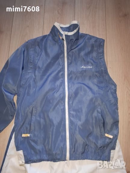 Спортен екип в две части, синьо горнище и бяло долнище, горнището е с ципове на ръкавите и може да се ползва и като елек