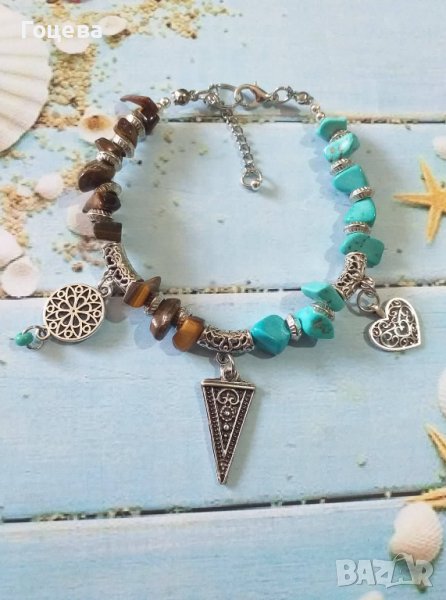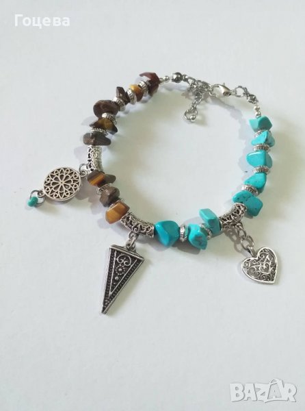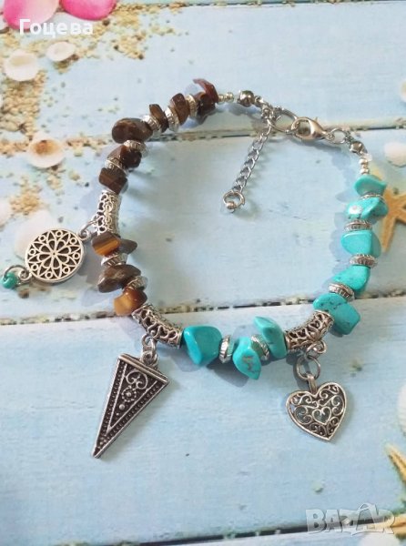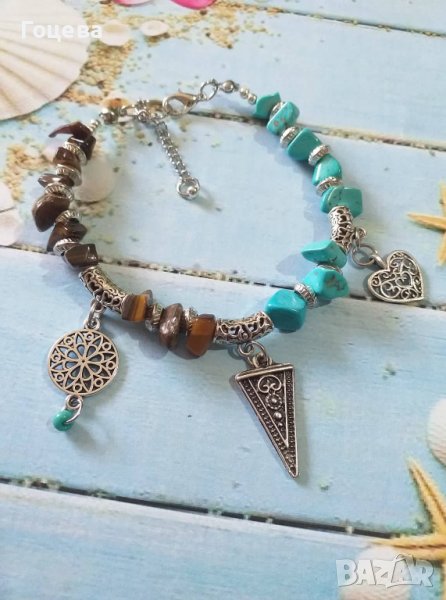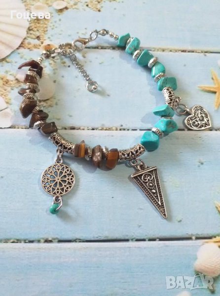 Много красива Бохо гривна със скъпоценни камъни Тюркоази и Тигрово око
