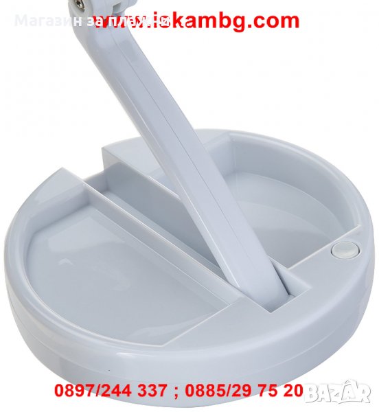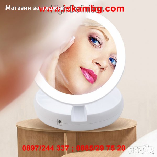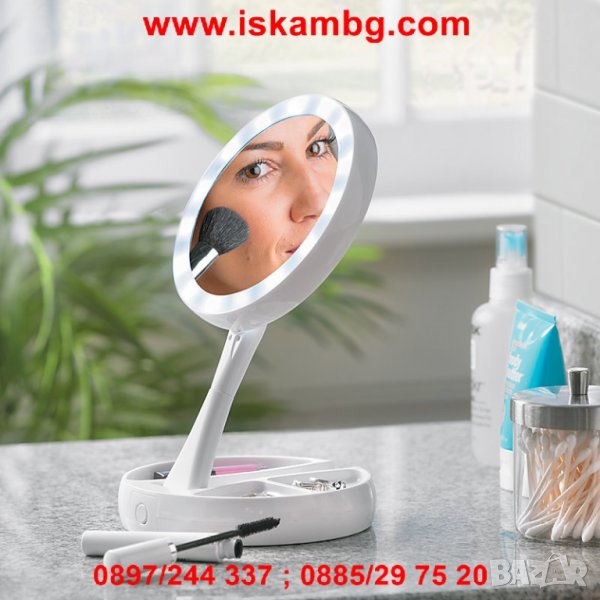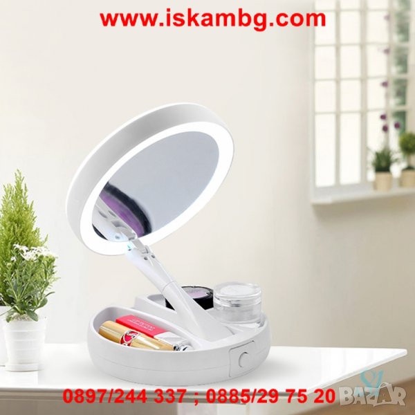 Страхотен козметичен аксесоар! Това огледало има две страни, една увеличителна (10 пъти) и една нормална. Сгъваемо е, което го прави удобно за използване и съхранение - идеално е за пътуване! Led светлините ви позвляват да го ползвате дори на тъмно и му придават звезден вид, а в основата има място за съхранение на козметични продукти, грим или други козметични аксесоари като ластици и фиби.