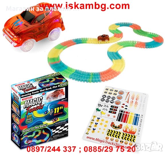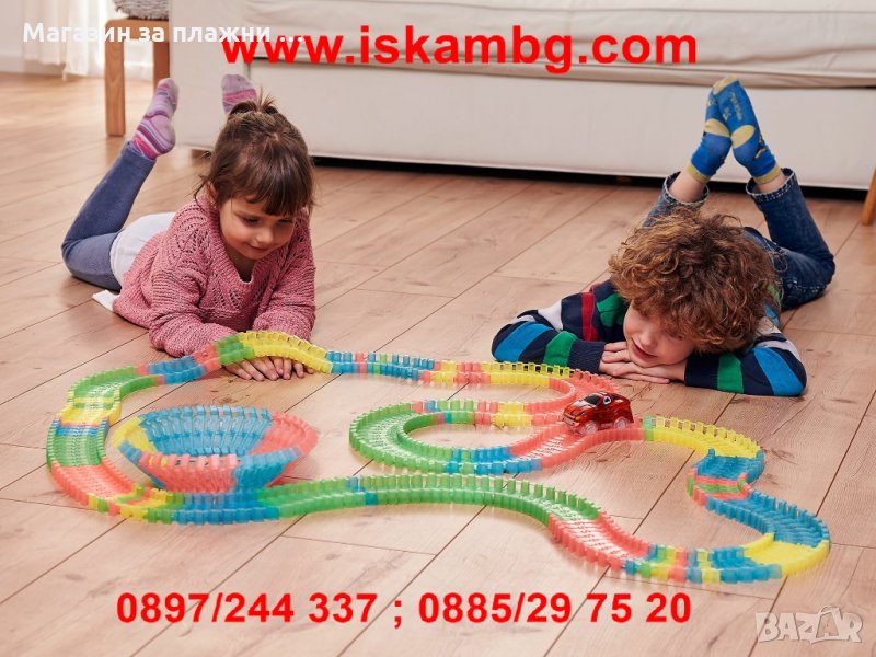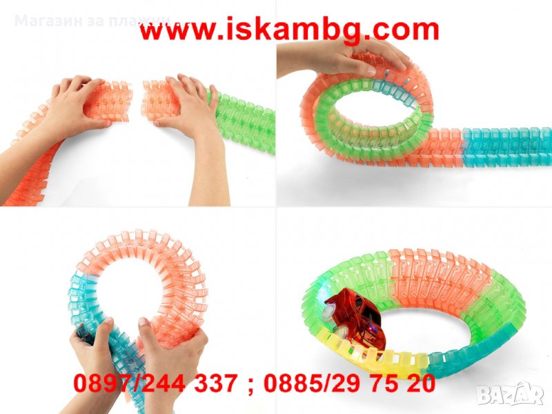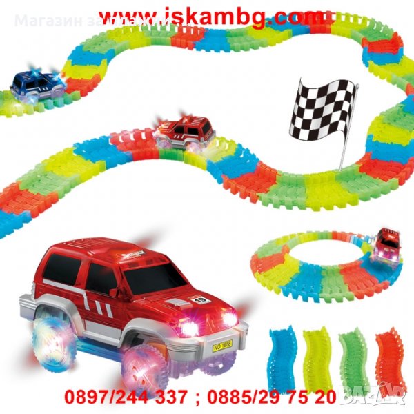 Невероятната състезателна писта променя формата си, огъва се и свети в тъмното в 4 свежи, неонови цвята, с които можеш да я сглобиш за секунди по различен начин всеки път!