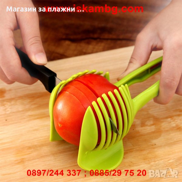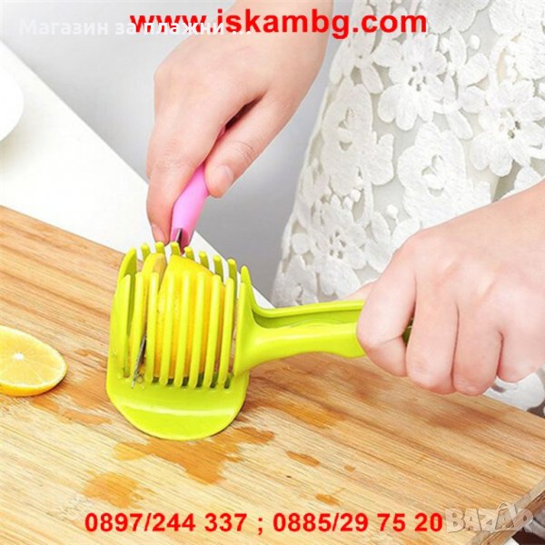 Уред /щипка/ за рязане на домати, лук, лимини и др. Уред за бързо, лесно и безопасно рязане на слайсове от различни плодове и зеленчуци, като домати, картофи, лук, лимони и други. Всичко което трябва да направите е да поставите плода или зеленчука и да прокарате ножа през отворите на уреда. Резултата е съвършено кръгли резени.