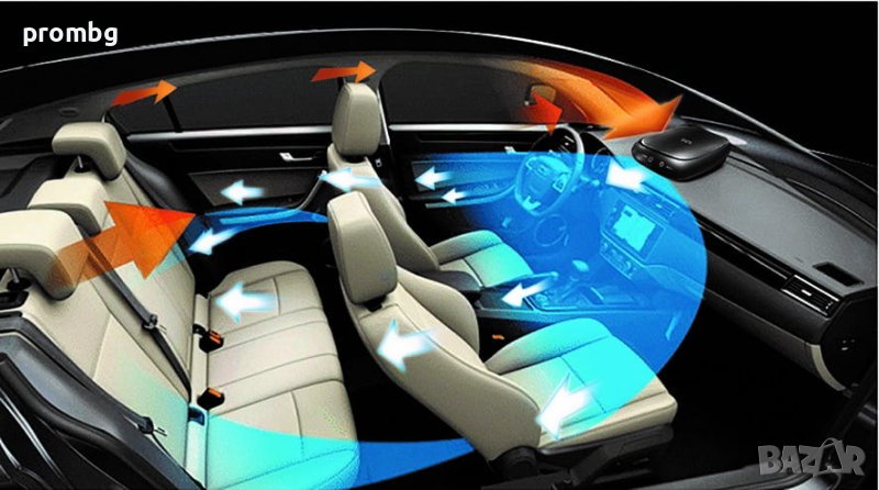 пречиствател за въздух за автомобил, Полша. Включва се към захранването 12 V с кабел, подходящ за леки автомобили, микробуси и автобуси. Дебит за пречистване 12 куб.м. на час. Две степени на вентилатора - бърза и бавна, йонизация, мощност 3 W. Захранващият кабел има букса за USB зареждане на смартфони и др. Изключително подходящ за хора с алергии и малки деца. Освен пречистваща функция до 95 процента от замърсяването на въздуха, успешно се премахва и неприятна миризма в автомобила.