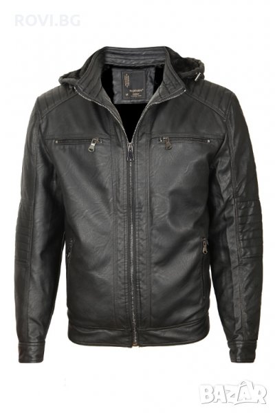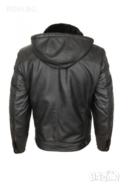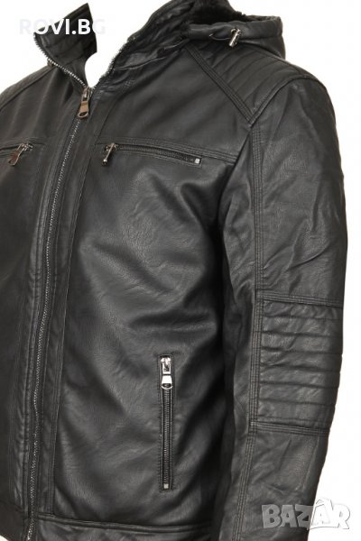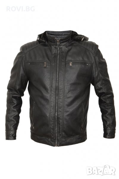 Мъжко якe от висококачествена еко кожа с качулка, която се сваля. Вътрешната част е изработена от пресована вата и каракул, което го прави изключително подходящо за студените дни. Същевременно е много леко и удобно. Разполага с четири външни джоба с цип и един вътрешен джоб.