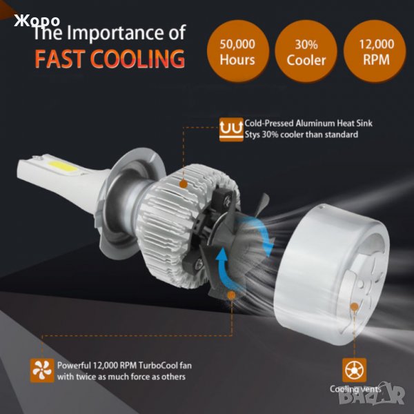 LED крушките са с COB ( chip-on-board) диод от ново поколение, монтиран върху алуминиев радиатор с вентилатор за по-добро охлаждане.