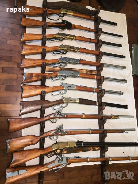 револвери, пушки, карабини, пистолети; както и за саби, шпаги, мечове и т.н. Снимките са с несглобена стойка в легнало положение и за това някои от сниманите върху стойката оръжия стоят малко неестествено. Цената е за стойка за 3/4 експоната и не включва поставените на нея експонати. Стойката за 4/5 е съответно 115 лв. за 6/7 е 140 лв. ; тази за 12/13 е с цена 190 лв. Стойките се продават нелакирани и боядисани в разглобено състояние, за да се транспортират лесно и всеки сам да реши къде точно да монтира напречните дъски / разпънките, които служат и за скриване на закрепящите планки. Не е включен обков. Съобразно интериора могат да се байцват в цвят или просто да се лакират.