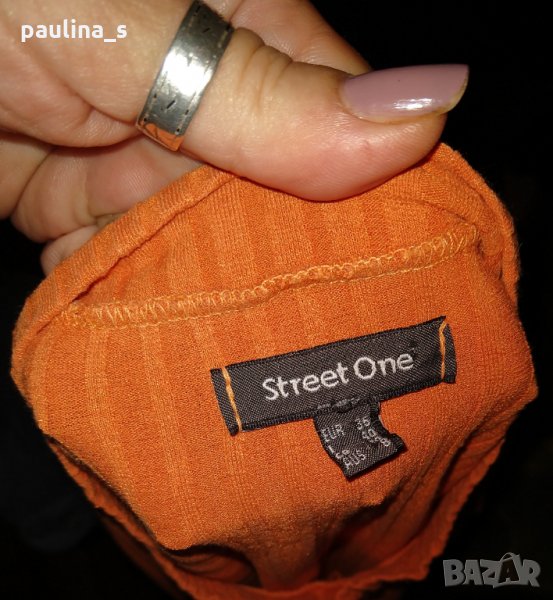 1. Колаж M / 2XL - "Street One". Цената е крайна 19,99лв. Блуза от еластично памучно трико с поло яка. Цветът е сигнален оранж, ексклузивен и оригинален. Трикото е плъте и еластичен рипс, стегнат, с прибращ ефект за големите размери. Уникална дреха. Без дефекти.