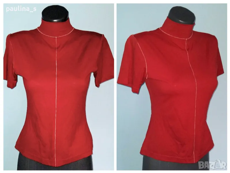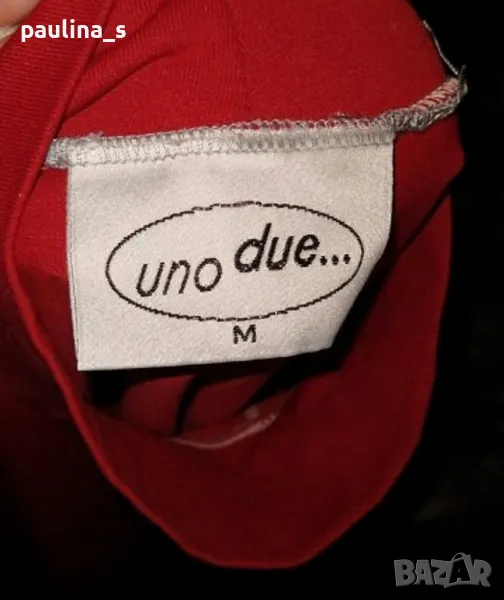 3. Колаж / M / 2XL - Италианска еластична блуза "uno due.. ". Цената е крайна 19,99лв. Блуза от еластична ликра в червено с контрастни бели тегели. Моделът е обран и леко втален. Материята е еластична ликра и покрива няколко номера, без дефекти и етикет. Приятна е на допир и много ефектна.