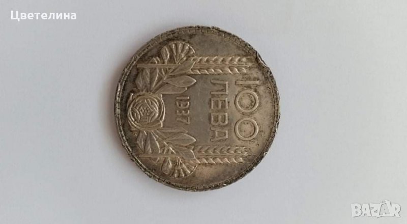 страна е изписано 100 лева и 1937, а от другата страна е ликът и надпис Борис