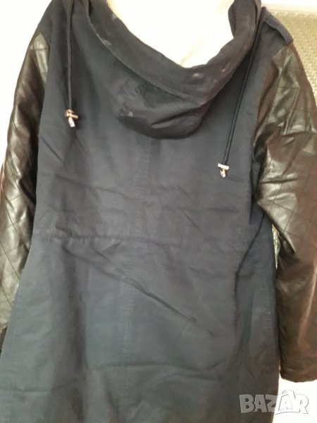 Яке от плат и кожа, с вътрешна топла подплата, с качулка, 2 външни джоба, черен цвят. Ципа заяжда, но има и допълнително тик так копчета отпред, с които якето се закопчава. Размер XL-2XL, ширината отпред подмишници - 54 см /или обиколка 108 см/, дължина от рамото до долу - 82 см. Отговарям на съобщения тук, изпращам с куриер с отстъпка, преглед и тест, или лично предаване в София.