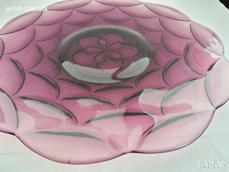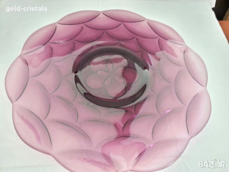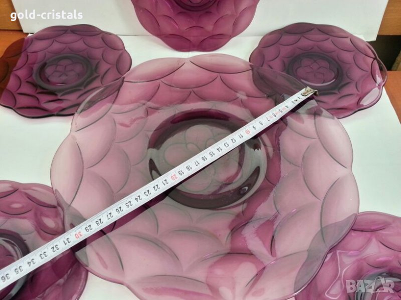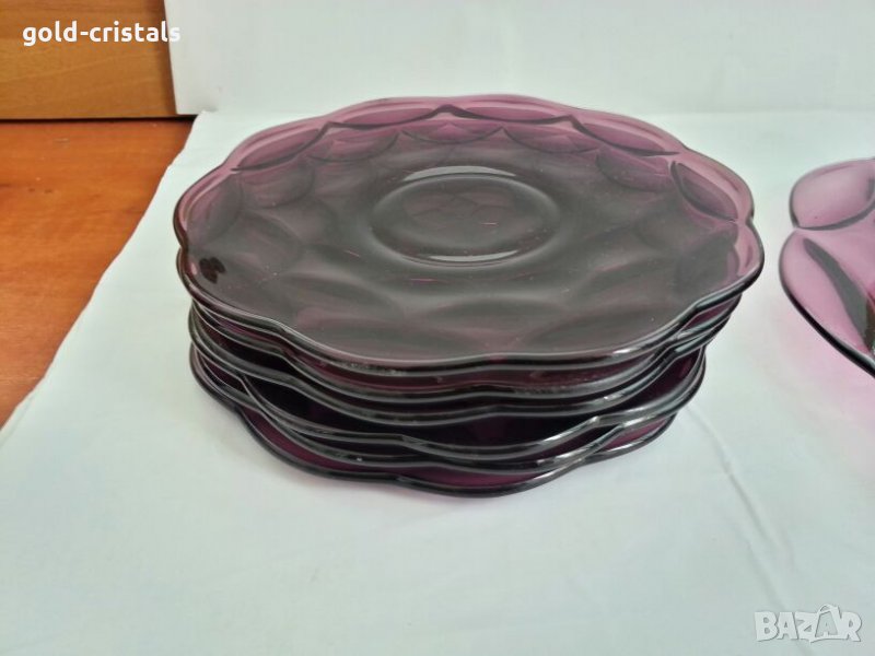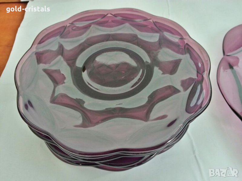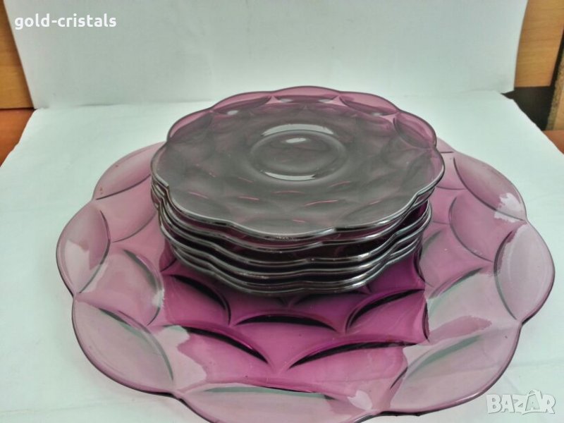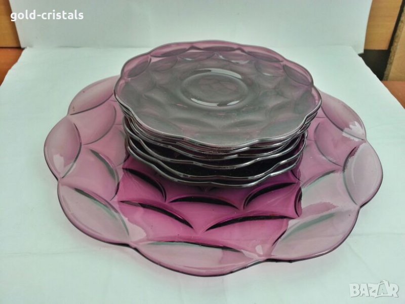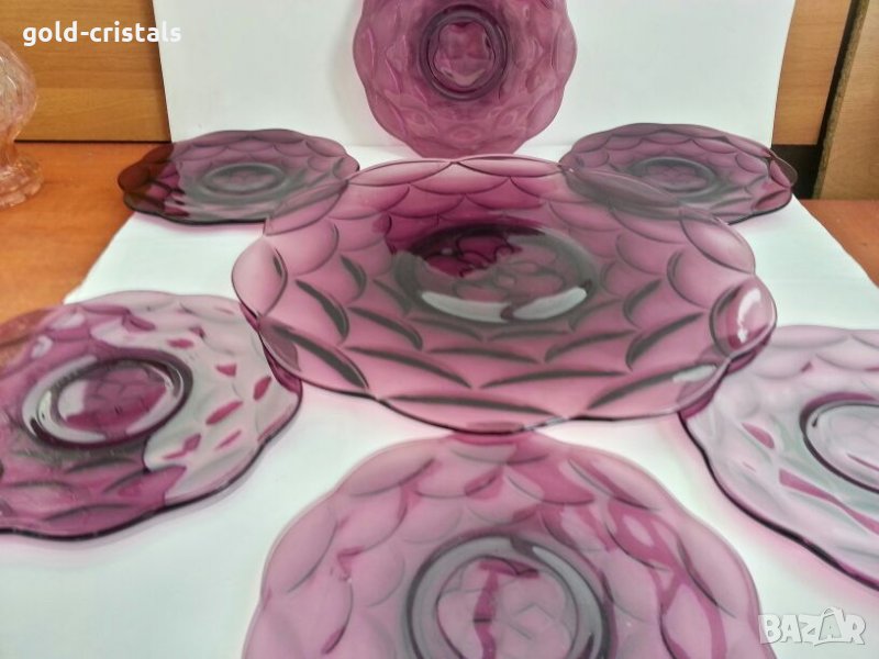 Антикварен сервиз цветно стъкло лилаво кристално стъкло една голяма чиния плато поднос фруктиера и 6бр чинии комплект сет лот ретро арт декор винтидж колекция стар старинен антикварни предмети обзавеждане за дома и семейството подходящи за подарък за ценители и колекционери