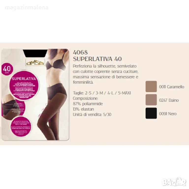 OMSA Superlativa 40 гладък чорапогащник с плътност 40DEN, полупрозрачни чорапогащи с тяло, което подчертава фигурата, предлага максимален комфорт и свобода на движение, произведени от италианската марка за безшевни чорапогащници OMSA / ОМСА. Персонализирана анатомична талия, гарантираща перфектно прилягане и прозрачна предна и задна част. Обработка Silver Clean със сребърни йони за максимална хигиена и свежест през целия ден. Цената е за 1 бр.