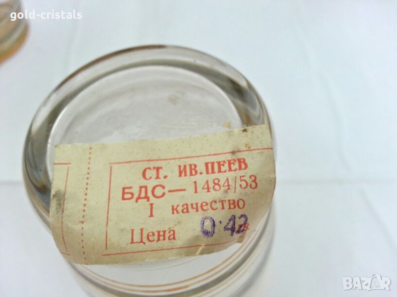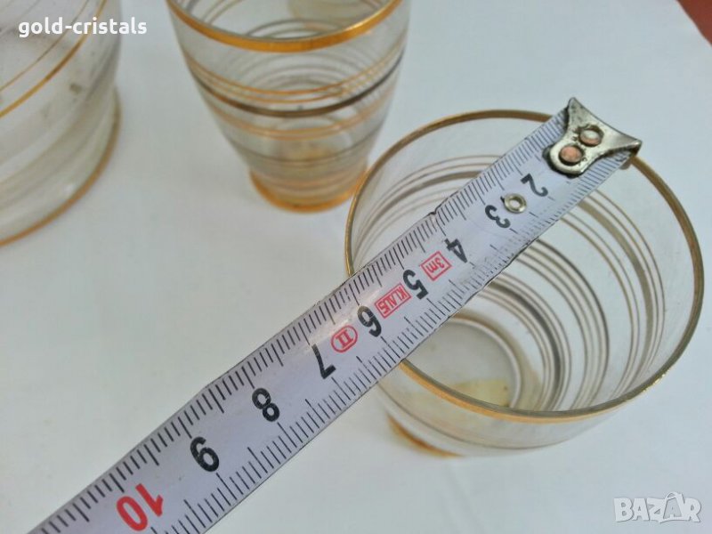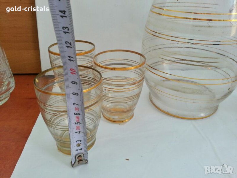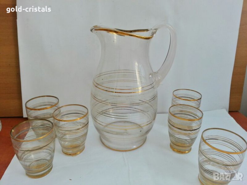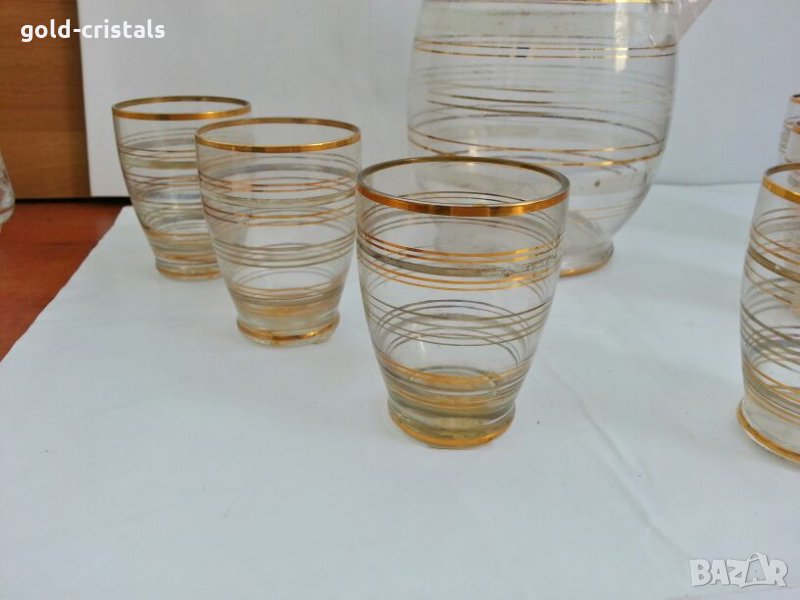 Ретро стъклени чаши и кана 53 г неизползван с етикети стъклена кана и 6бр чаши с златни кантове позлата комплект сет лот стар старинен ретро арт декор винтидж колекция стари старинни антикварни предмети обзавеждане за дома и семейството подходящи за подарък за ценители и колекционери