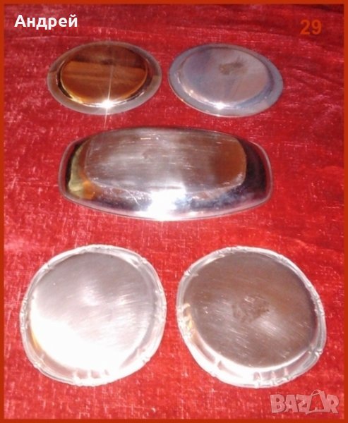 Комплекта се състои от 3 бр. кръгли без орнаменти миниатюрни(диаметър-10,6 см) алпака чинийки + две още по малки(диаметър-9,5см.), но с щамповани красиви орнаменти по външния диаметър. Последния „елемент от алпака лота е малко подносче, тип ваничка(дължина-17см.,ширина-10см.,и височина-1,5см),която също е от …алпака. Не знам за Вас, но аз на „първо четене“ все пак се сещам за едно „поносимо“ приложение на елементите на лота, а именно за…неприятни гости…Предимството с тези алпака съдчета е, че освен сервирането в стил „гурме“, то сякаш казва: „е…,хайде, криза е ,пък и няма да стоиш тук цял ден я…“.