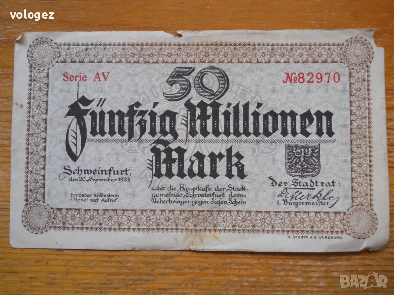 9. 50 милиона марки 1923 г. - Швайнфурт, Бавария - 12,78 € / 25 лв