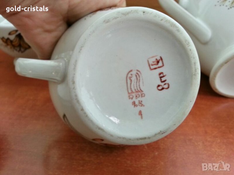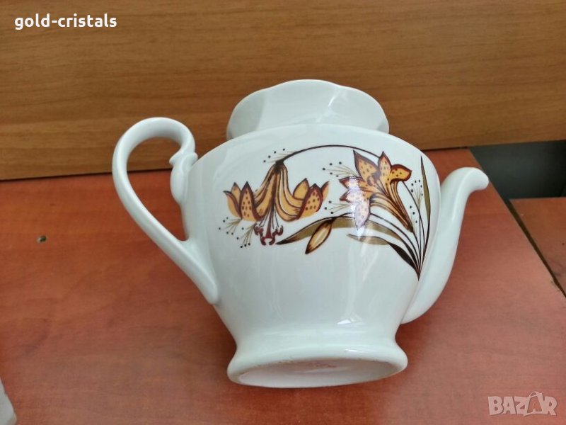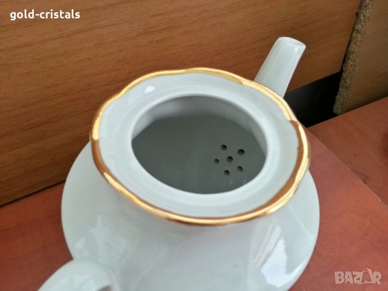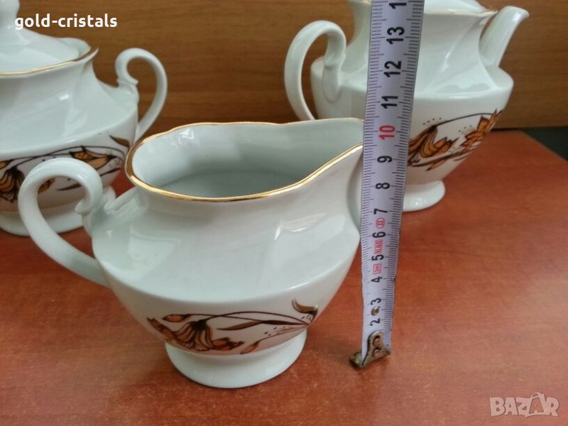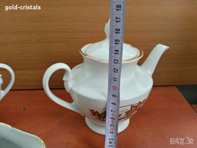 Руски порцелан чайник с капаче захарница с капаче каничка латиера неизползвани без забележки с златни кантове позлата рисувани и от двете страни маркирани съветски ссср ретро ар сит декор винтидж колекция стари старинни антикварни предмети обзавеждане за дома и семейството подходящи за подарък за ценители и колекционери
