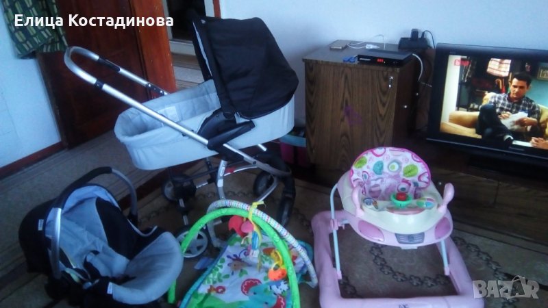 Зимния кош и коша за новородено са ползвани малко,летния кош е ползван повечко. Цената включва количката,проходилката и гимнастиката.