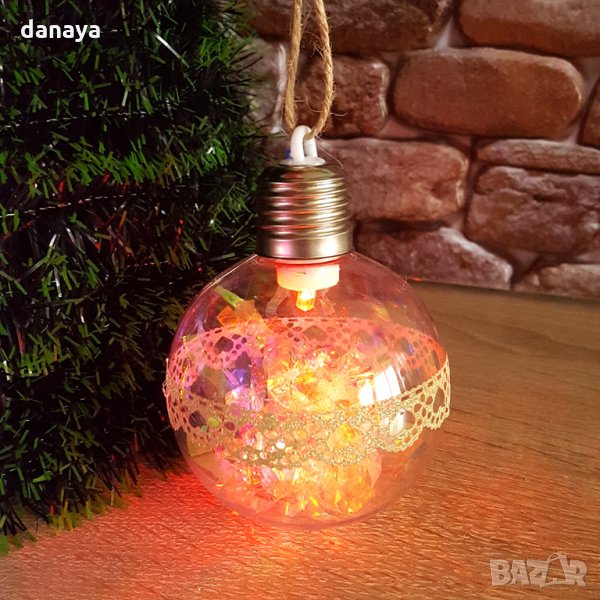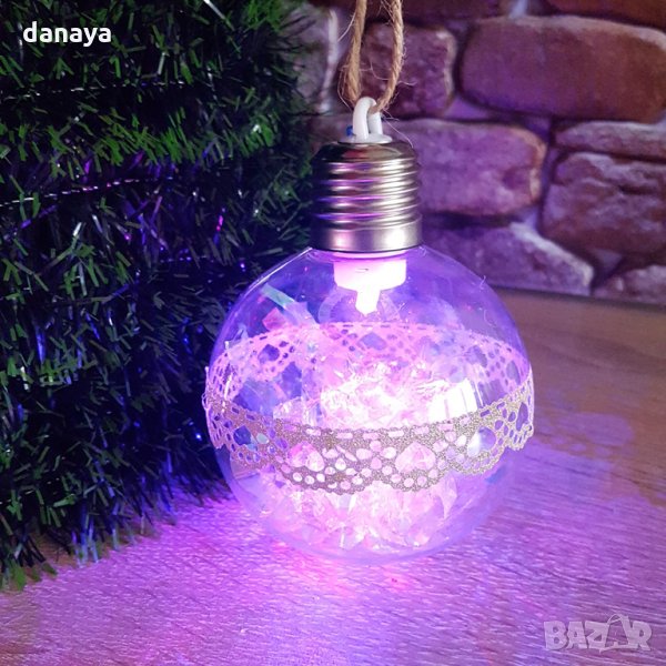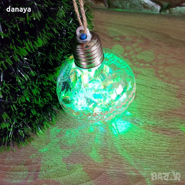 коледна топка за украса на елха с преливащи цветни светлини. Всяка топка е декорирана в центъра си с пвц лепенка тип дантелка. С връвка за закачане на коледната елха. С бутон за включване и изключване на светлините. Когато е включена, топката изглежда много ефектно, където и да я поставите. Изработена от PVC. Работи с 3 LR 44 батерии, които са включени в комплекта.