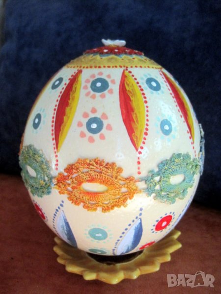 Рисувано щраусово яйце за благоденствие в дома, вярност, печалба, успехи, плодородие, късмет във всяко добро начинание. В миналото да го притежаваш е било нарицателно за богатство. От тогава е изразът: