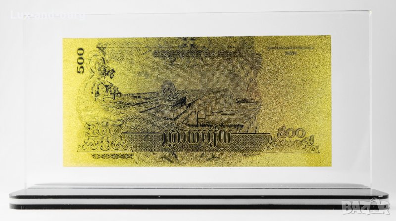 Златна банкнота 500 Камбоджански риела в прозрачна стойка - Реплика → Обява 27080091