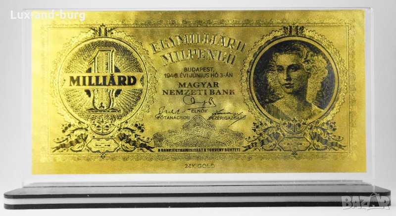 Златна банкнота 1 Милиард Унгарски пенго в прозрачна стойка - Реплика, снимка 1 - Нумизматика и бонистика - 27080288 Златна банкнота 1 Милиард Унгарски пенго в прозрачна стойка - Реплика, снимка 2 - Нумизматика и бонистика - 27080288 1/2