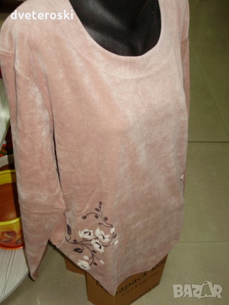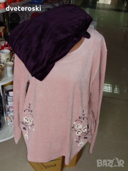 Моделът с цветята е бежово горнище с кафяв панталон.