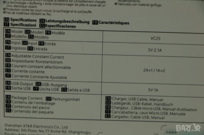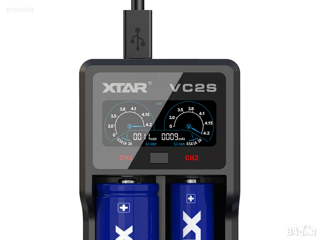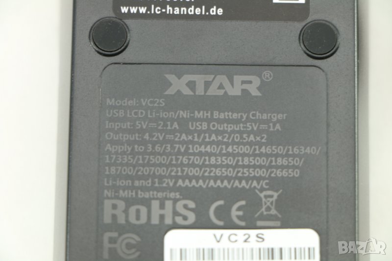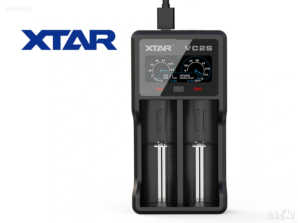 USB зарядно за Li-Ion / Ni-MH батерии, Германия, XTAR. Тип VC2S с професионален VA-LCD екран показва състоянието на зареждане в реално време. USB захранването позволява захранване, чрез адаптор 220 волта или чрез запалката на автомобила. Съдържа 2 автономни канала за зареждане. Захранване 5 V. Автоматично идентифициране на използвания тип батерия. Функцията за активиране 0 V съживява презаредена батерия. Мек старт и тристепенно зареждане (TC-CC-CV). Поддържа следните 3 / 3,7 V литиево-йонни / IMR / INR / ICR акумулаторни батерии: 10440 / 14500 / 14650 / 16340 / 17335 / 17500 / 17670 / 18350 / 18490 / 18500 / 18650 / 18700 / 20700 / 21700 / 22650 / 25500 / 26650