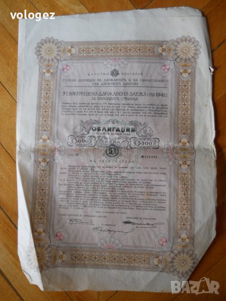 5. облигация - 5000 лв - 1941 г - 5,11 € / 10 лв