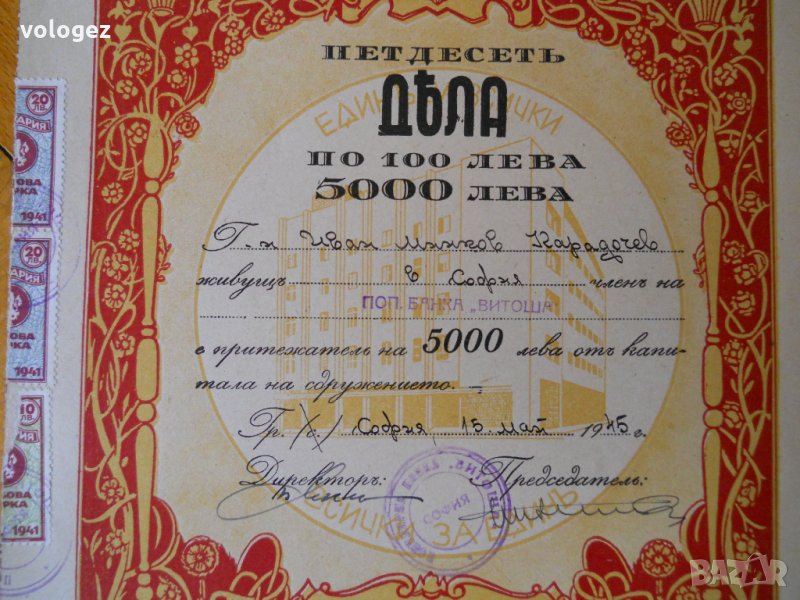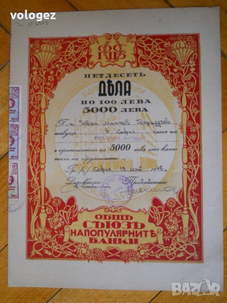 4. акция / дял - 5000 лева / Съюз на популярните банки 1945 г - 10,23 € / 20 лв