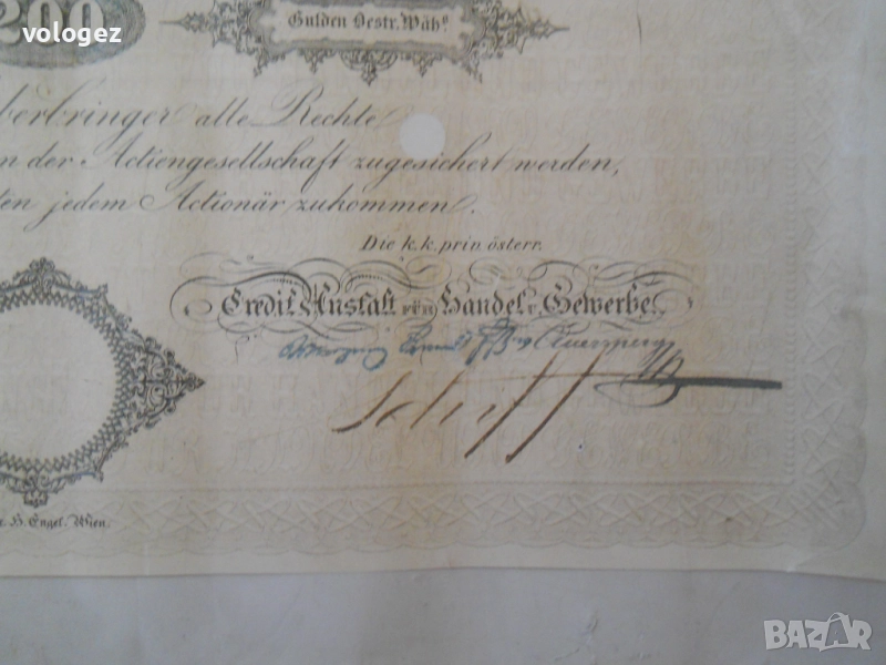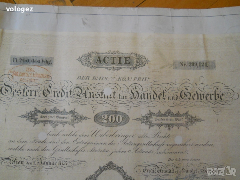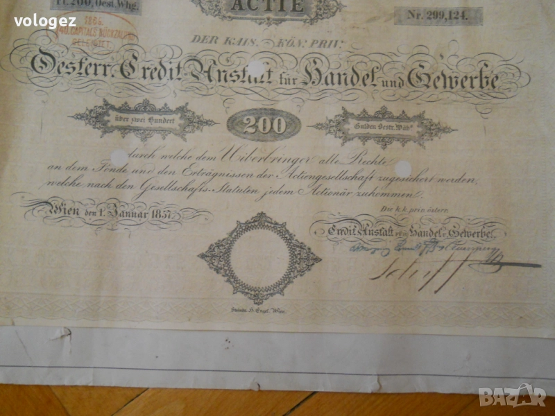 7. Стара акция (ACTIE) на "Oesterr. Credit Anstalt für Handel und Gewerbe" (Австрийска кредитна институция за търговия и промишленост) на стойност 200 гулдена, издадена във Виена на 1 януари 1857 г.. Акцията представлява дял от собственосттта на аукционерното дружество - 48,57 € / 95 лв