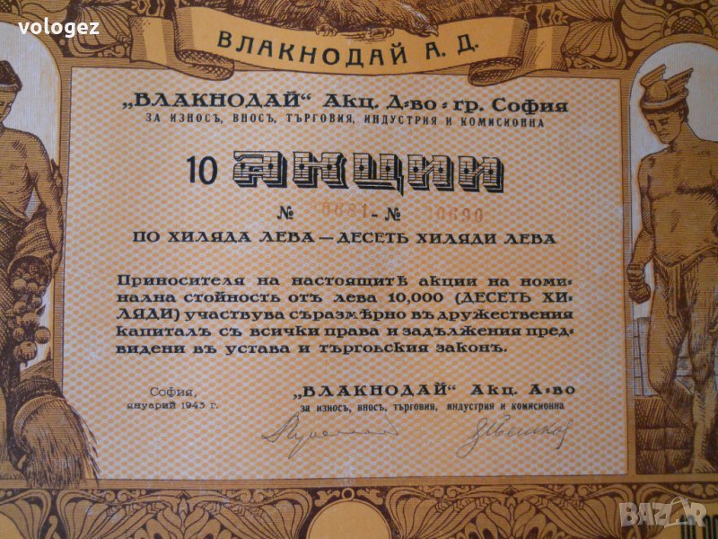 2. акция / дял - 10000 лева / АД Влакнодай - София 1943 г - 12,78 € / 25 лв