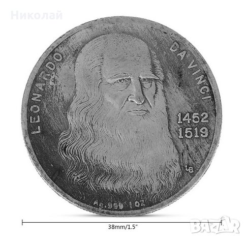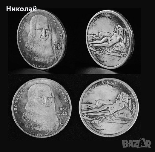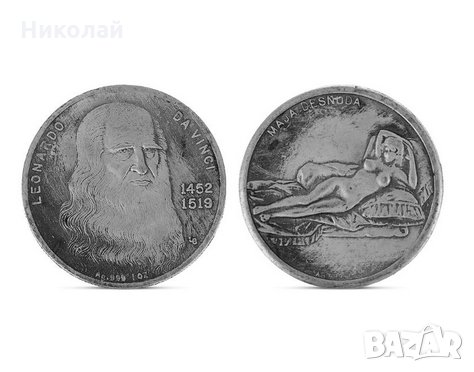 Колекционерска монета 500 г. от смъртта на Леонардо да Винчи. Микро релеф от двете страни : от едната страна е ликът на Леонардо с годините на раждане и смърт , от другата страна е гола жена / женско тяло . Релефен гурт / кант .