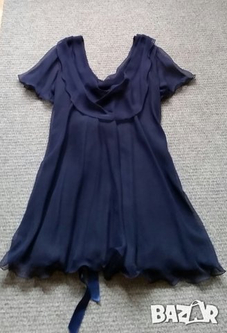 Тъмно синя- Ирина Сердарева- бутикова- ново- 70лв. Роклята е такъв модел, че става и за М, S и XS. Самия модел е широк свободен модел е, а от вътрешната част има коланче от където се регулира, завръзва се за да се получи този ефект. Дължина от шев на рамо до долу е 77см, а отзад е 2-3 см по- дълго. Бод бюста, там където е края на дантелата и се разкроява надолу ширина 41- 42см. Надолу и настрани се разкроява.