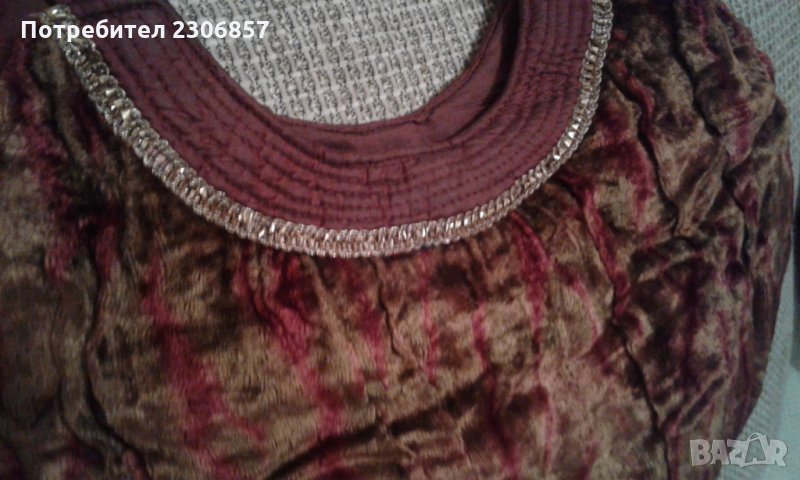 Красива дамска чанта от червено-оранжево преливащо кадифе и стилна украса. С две средно дълги дръжки и вътрешен джоб.