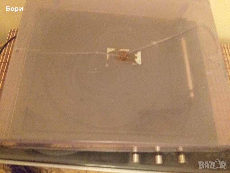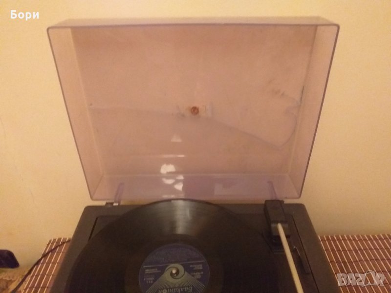 Работещ с вграден усилвател ,доза и игла в добро състояние.плотера се върти,Спукан капак отгоре