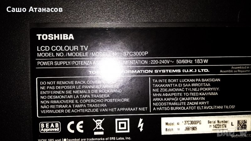 TOSHIBA 37C3000P със счупена матрица , PE0252 [A] ,PE0253 [N] , PE0250 [A]-1 , 6870C-0088D ,LC370W01
