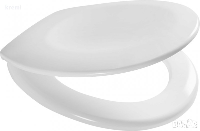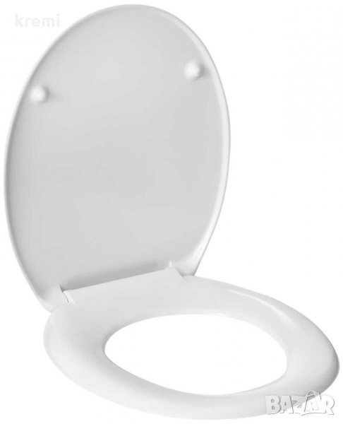Седалка за тоалетна чиния с механизъм за плавно затваряне. Изработена от лесен за поддържане дуропласт. С хромирани метални панти.