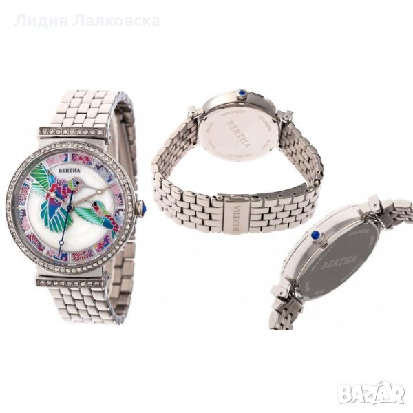 Красив дамски чàсовник на марката Bertha, със сребриста каишка и интересен мотив Колибри на циферблата.