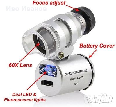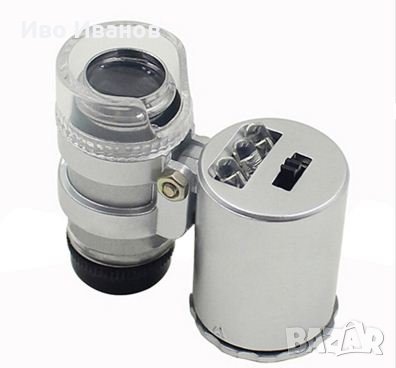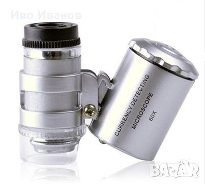 Мини микроскоп 60 пъти увеличаващ, с две лед светлини бяла и синя за банкноти. С кожено калъфче за удобно