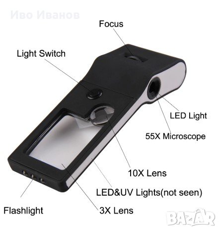 прецизна лупа/микроскоп 3X-10X-55X с подсветка от 6 светодиода и ултравиолетова