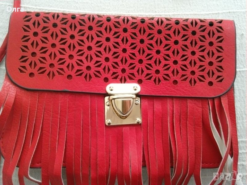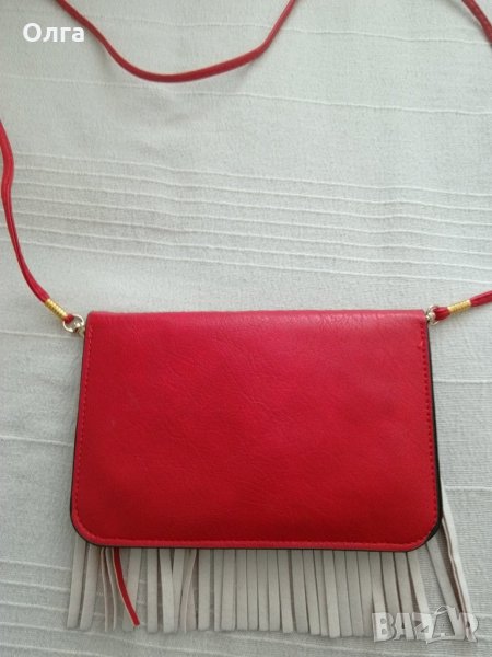 Червена чантичка с подвижни презрамки. Дължина 21 см, височина 14 см, дължина на презрамките 133 см. Две прегради. Отлично състояние. Цена 5 евро.