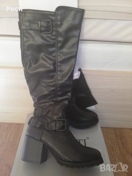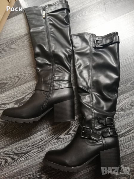 Дамски ботуши с височина до коляното в черна еко кожа, дебел ток - нови , размери 38 и 39 номер