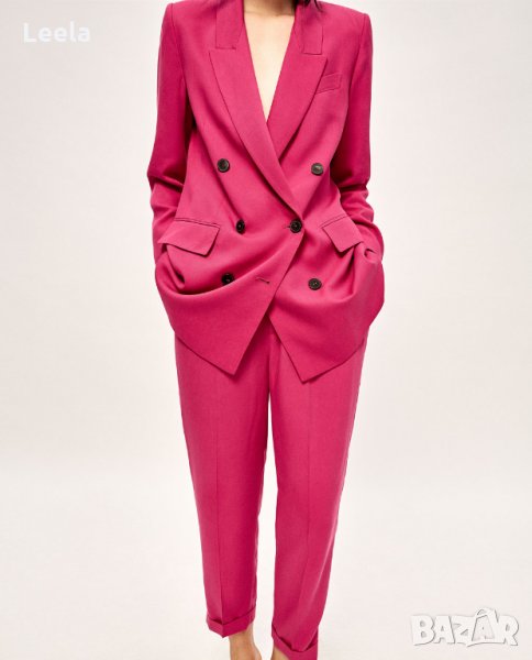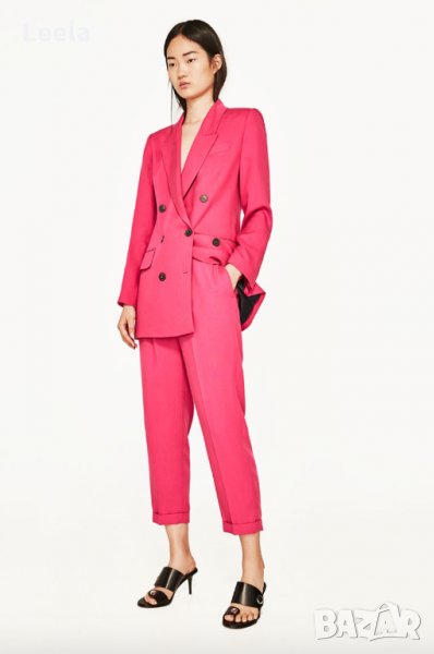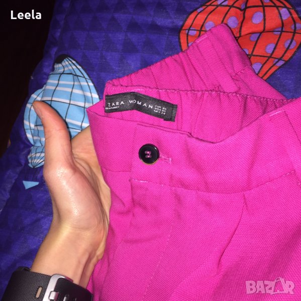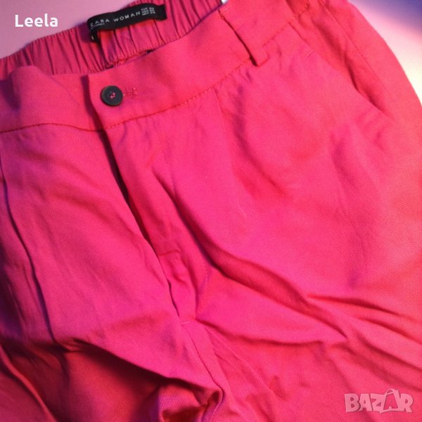 Цикламенорозов панталон Zara с дължина до прасеца, еластично корселе (колан на кръста), басти и навити крачоли.