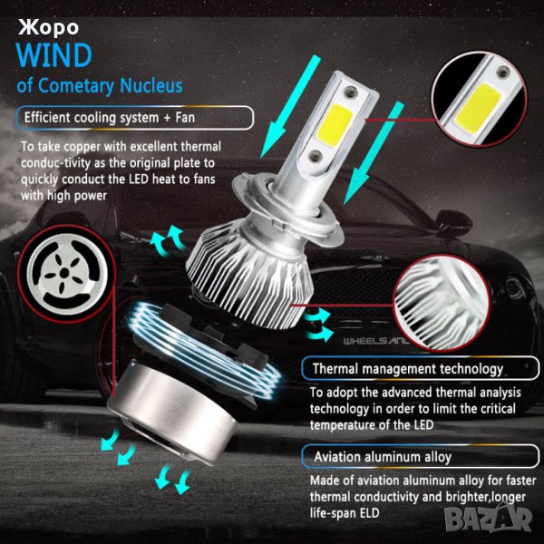 LED крушките са с COB ( chip-on-board) диод от ново поколение, монтиран върху алуминиев радиатор с вентилатор за по-добро охлаждане.