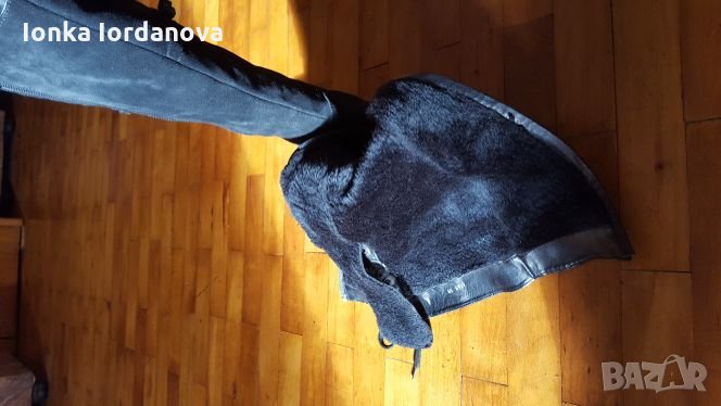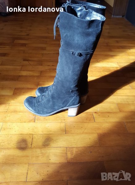 Високи ботуши на среден ток от естествен велур.С цип отстрани и връзки отпред и с украсителна панделка.Отвътре са с топла облицовка.Подметка грайферна.