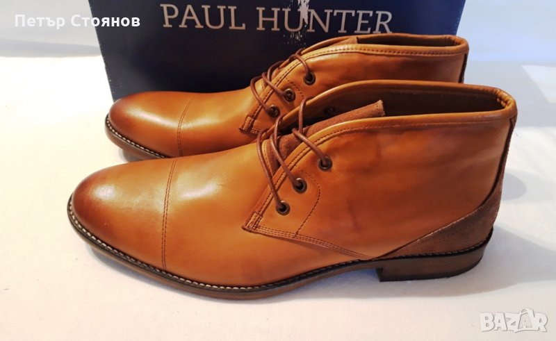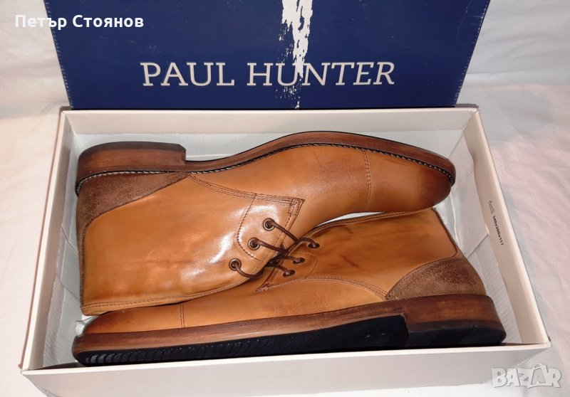 Предлагам чудесни елегантни мъжки кларкове на известната и реномирана марка за дрехи и обувки Paul Hunter. Обувките са чисто нови, в кутия, купувани са на разпродажба на цена от 69.95 евро при редовна цена от 99 евро. Изработени са в Португалия ръчно от естествена кожа, цветът е кафяво /коняк/, хастарът е от текстил, а стелката от естествена кожа. Подметката е от каучук, шити и лепени са. Дължината на стелката е 29.5 см., височината на тока е 3 см. , височината на цялата обувка е 13.5 см. Изпращам с Еконт и възможност да се прегледат и премерят.