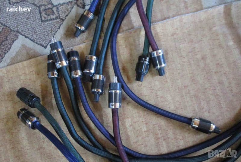 Захранващи кабели от висок клас. Кабелите са конструкция на моя приятил Иво със солидкор мед от furukawa japan. Геометрията на кабела е специална,с използването на технология,което прави кабела независим от магнитни и радиочестотни смущения и на практика вашата система ще работи много по добре. Не се влияе дали е на пода или на постаменти,както и от другите кабели. Подобни кабели се използват от фирмата THRAX AUDIO. Кабелите са с накрайници на Акролинк, карбон и родий,което най много ми хареса на звук. Кабелите са с най добре свирещата дължина – 2.18 м. Сериозни кабели,които надсвирват многократно по скъпи. Всеки може да ги види и чуе при мен. Налични три броя,останалите ги ползвам в системата си. – 1190 лв.