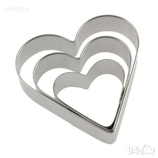 Комплект от 3 броя метални формички за сладки сърца. Метални резци за рязане на тесто и оформяне на дребни сладки курабии, меденки, бисквити и други сладкиши. Формичките са в комплект от 3 броя с форма на сърце, като трите сърца са с различен размер.