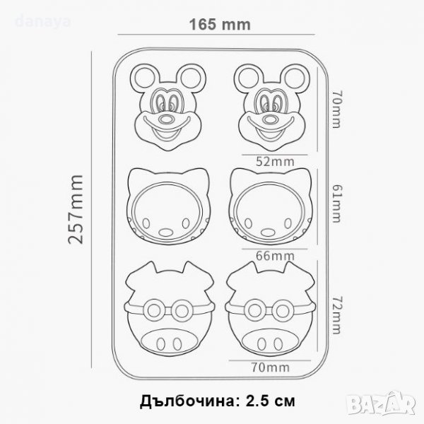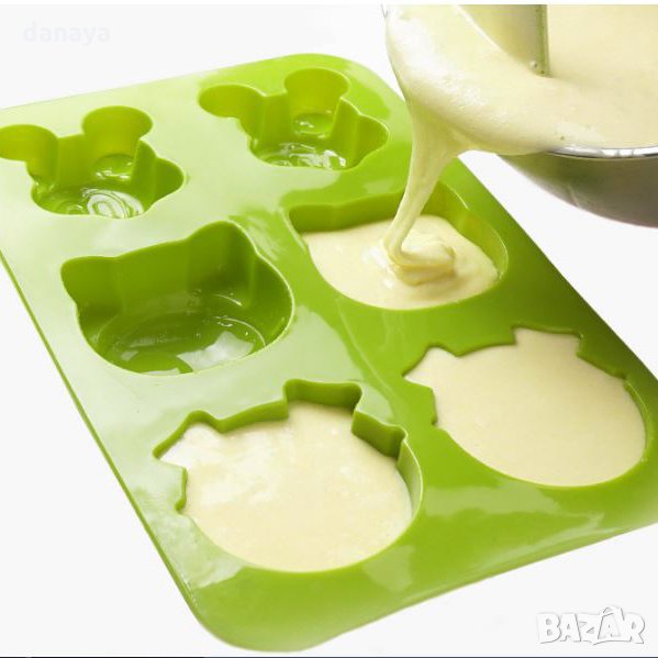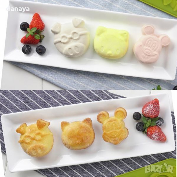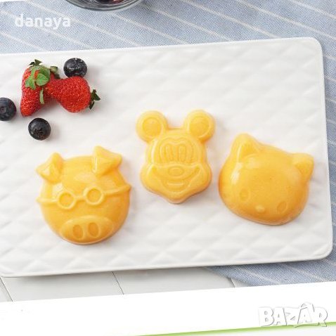 Силиконова форма за сладки с любими дисни герои - Мики Маус, Hello Kitty и Pig. Идеална за приготвяне на домашни дребни сладки, мъфини и кексчета с героите от любимите детски филмчета. Може да се използва и за замразяване на различни хранителни продукти.