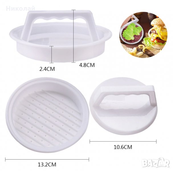 Преса за Бургери , кюфтета , картофени кюфтета , шницели и др. Дъното и капака са оребрени за да не залепва каймата за пресата . На дъното има отвори за изтичане на излишна кръв , вода ( ако има такива ) . Лесно можете да оформите идеални бургери и кюфтета с еднаква големина . Подходяща е за хора които обичат бърза храна , готвят у дома и прекарват доста време в кухнята .