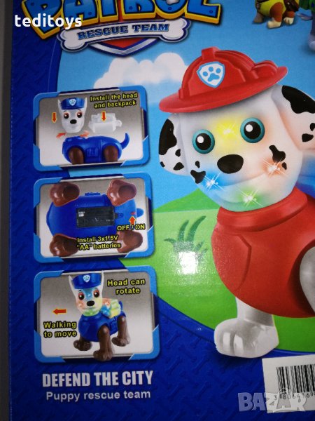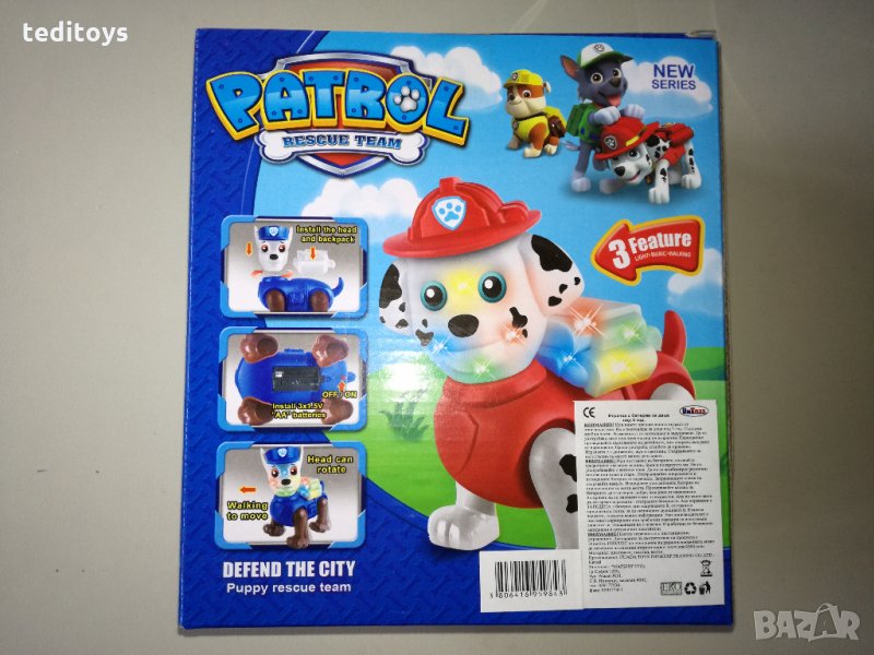 Детската интерактивна играчка Пес Патрул е музикална. Тя може да се движи, да издава звуци и да свети